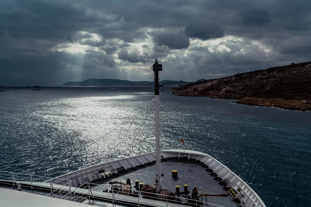 Η ζωή μέσα σε ένα πλοίο της γραμμής, και δη τον χειμώνα, έχει τις δικές της συμβάσεις μέσα στις συχνές φουρτούνες. Έχει άλλο περπάτημα. Εκείνο του πληρώματος που συνηθίζει να μη χάνει την ισορροπία του, συντονίζοντας το βήμα του με την κίνηση του κυματισμού. Είναι φορές που ο χρόνος μοιάζει ατελείωτος μέσα στην προκαθορισμένη ρουτίνα της βάρδιας. Έχει όμως τη διαρκή κίνηση και μαγικές εικόνες που δύσκολα βρίσκεις στις ρουτίνες της στεριάς. Δεν είναι λίγο να «χαιρετάς» κάθε μέρα τα νησιά – ακόμη κι αν δεν τα χαίρεσαι. Και αν η επιστροφή μοιάζει μακρινή, τουλάχιστον υπάρχει το ταξίδι.