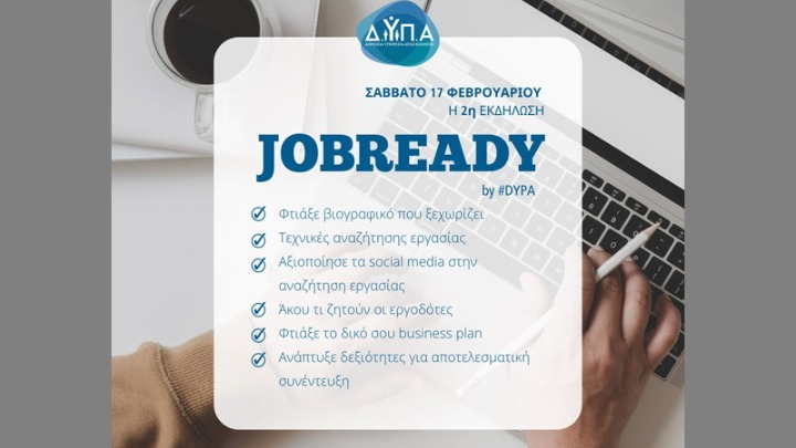 Τον Νοέμβριο του 2023, η ΔΥΠΑ προχώρησε στη διοργάνωση του «JobReady by DYPA», μίας εκδήλωσης που αφορούσε αποκλειστικά την παρακολούθηση workshops συμβουλευτικής παράλληλα με ομιλίες στελεχών επιχειρήσεων για την επαγγελματική ανάπτυξη και εξέλιξη. Η συμμετοχή ήταν αθρόα και, έτσι, η ΔΥΠΑ επανέρχεται με το 2ο «JobReady» το Σάββατο, 17 Φεβρουαρίου 2024, στο ξενοδοχείο Wyndham Grand Athens (Μεγ. Αλεξάνδρου 2, 10437, Αθήνα, στάση μετρό Μεταξουργείο).