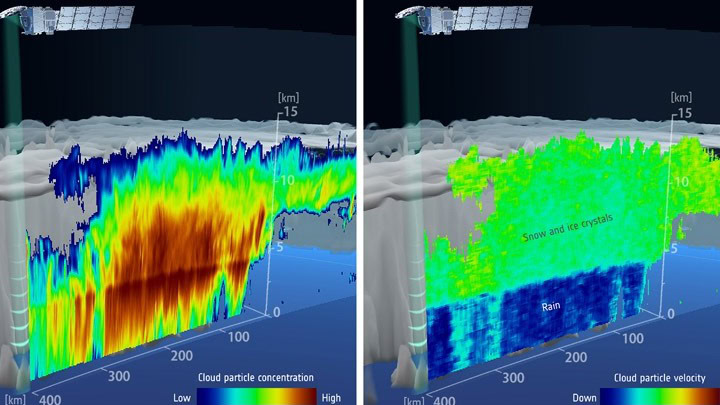 Στην εικόνα που δημοσιοποιείται παρουσιάζονται λεπτομέρειες σχετικά με την εσωτερική δομή των νεφών πάνω από τον ωκεανό, ανατολικά της Ιαπωνίας στις 13 Ιουνίου 2024. Στα αριστερά, τα δεδομένα αποκαλύπτουν την κατακόρυφη συγκέντρωση των σωματιδίων των νεφών. Το πυκνότερο τμήμα του νέφους βρίσκεται στο κέντρο του, όπου υπάρχουν περισσότερα μεγαλύτερα σωματίδια. Στα δεξιά διακρίνεται η ταχύτητα πτώσης των σωματιδίων του νέφους. Οι χαμηλές τιμές στο ανώτερο στρώμα υποδηλώνουν κρυστάλλους πάγου και νιφάδες χιονιού που αιωρούνται ή πέφτουν αργά. Στο κατώτερο στρώμα, οι πολύ υψηλότερες τιμές ταχύτητας πτώσης υποδηλώνουν βροχή.